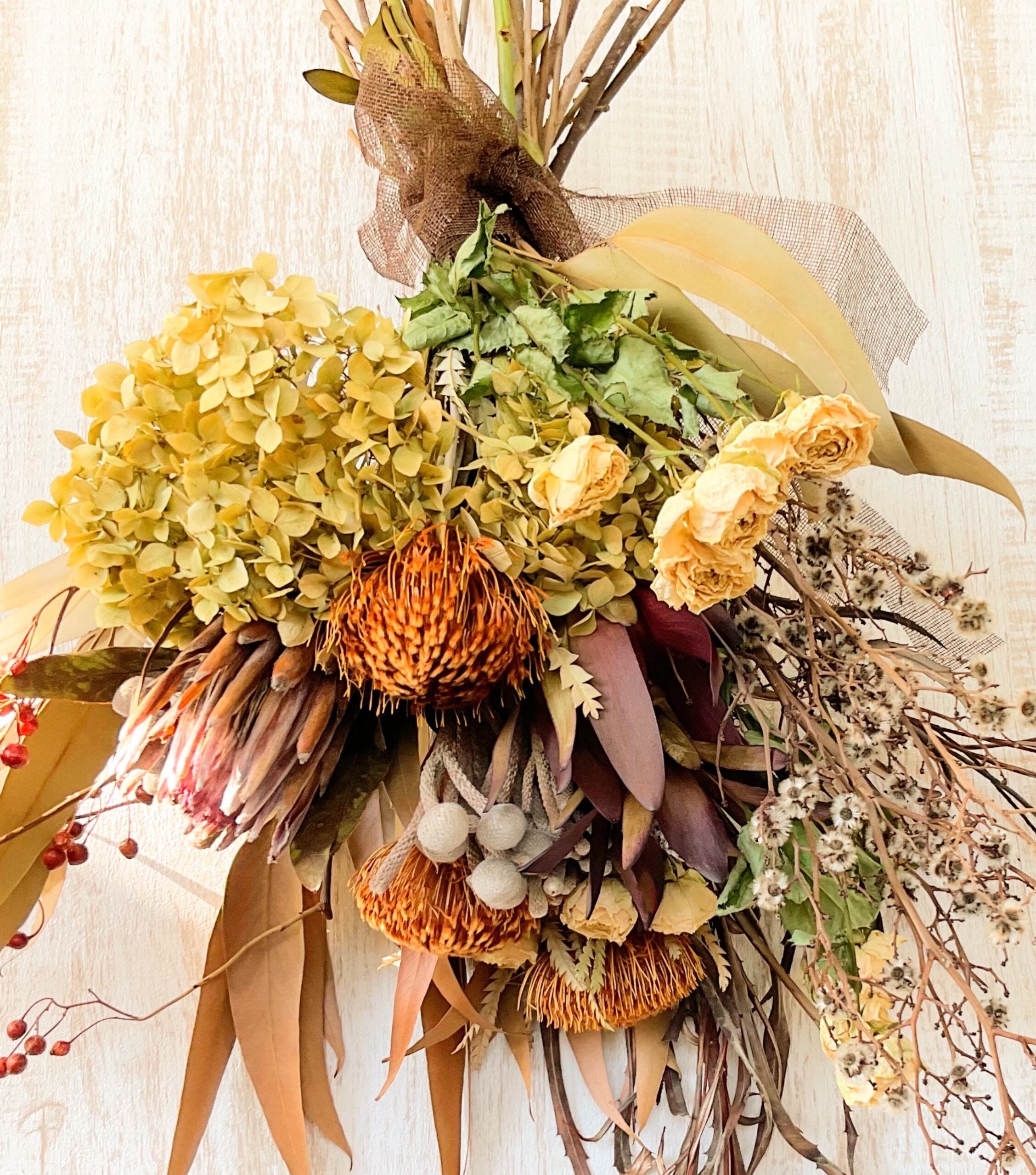 アジサイ、プロテア、シルバーブルニア、ドリアンドラ、ユーカリ、などのドライフラワーを使用したスワッグです。